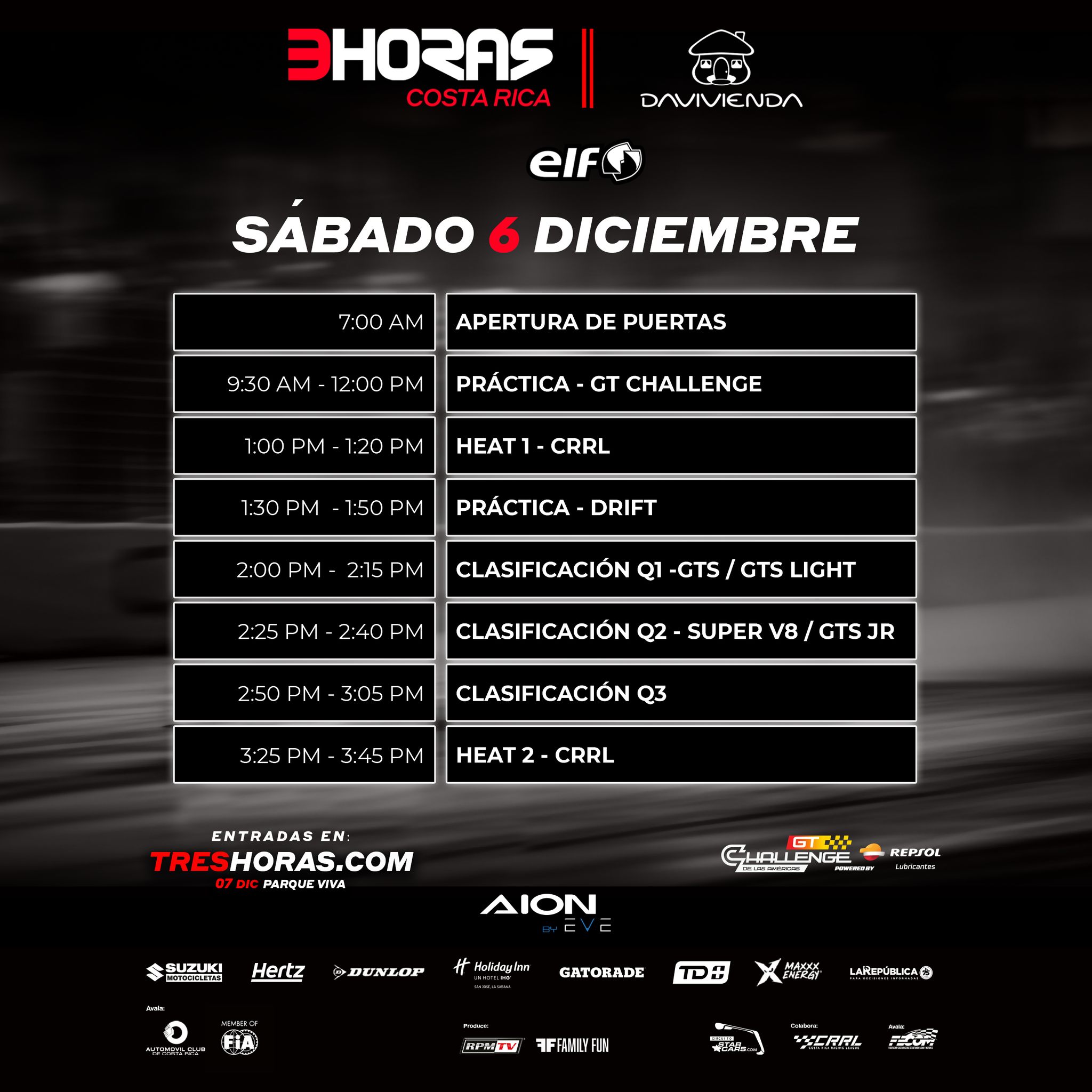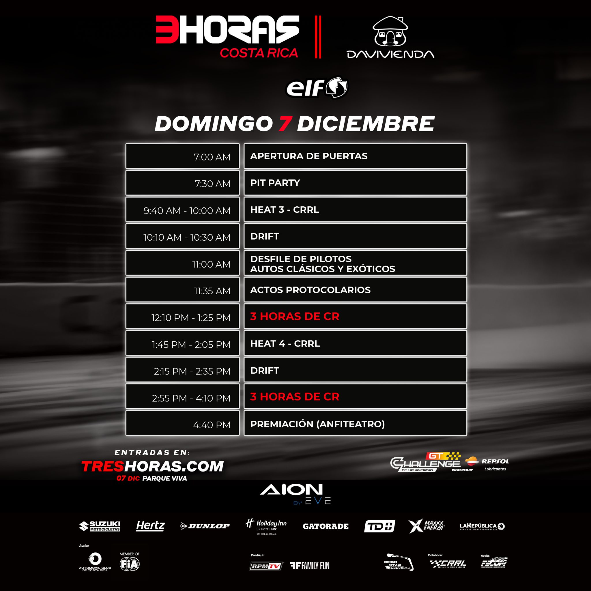 Faltan pocos días para cerrar oficialmente el calendario de competencias de automovilismo 2025 con la carrera más emblemática de Costa Rica, las 3 Horas de Costa Rica, que se correrán el próximo 7 de diciembre en Parque Viva.