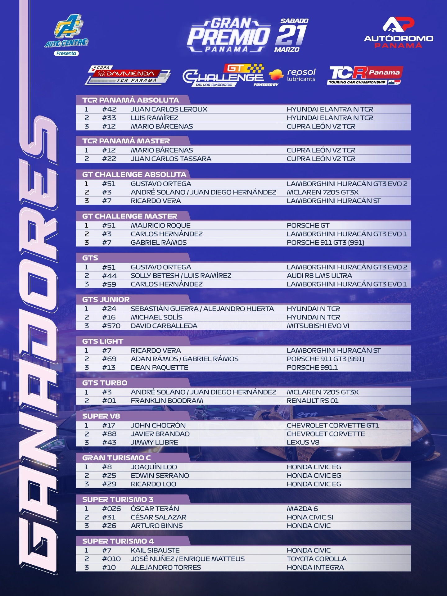 Con el triunfo en los dos heats, Ortega inició con el pie derecho en el campeonato más importante de la región, poniéndose como líder absoluto y de la categoría GTS, Solano y Hernández, por su parte, finalizaron segundos absolutos y primeros en la GTS Turbo.