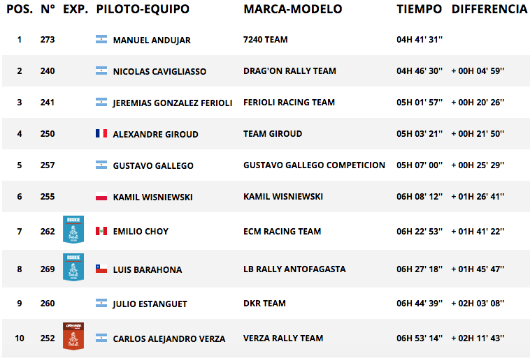 En cuadras, Manuel Andújar puso fin al dominio absoluto de Nicolás Cavigliasso en el Dakar 2019 y se adjudica su primera victoria de etapa. El joven piloto argentino lográ sacar 5 minutos al veterano, pero Cavigliasso permanece como sólido líder de la general con una ventaja de 1 hora 40 minutos la víspera de la meta final en Lima.