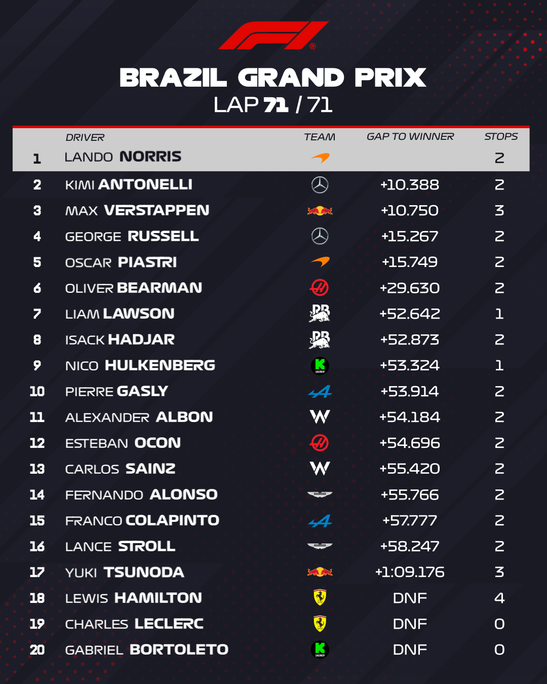 Fue la segunda victoria seguida de Norris. Venía de llevarse el Gran Premio de México el 26 de octubre y la victoria en Brasil afianzó al británico en la cima de la clasificación de pilotos, con 390 puntos. El quinto lugar de Piastri lo dejó a 24 puntos de distancia, cuando faltan tres carreras por disputar en la temporada.