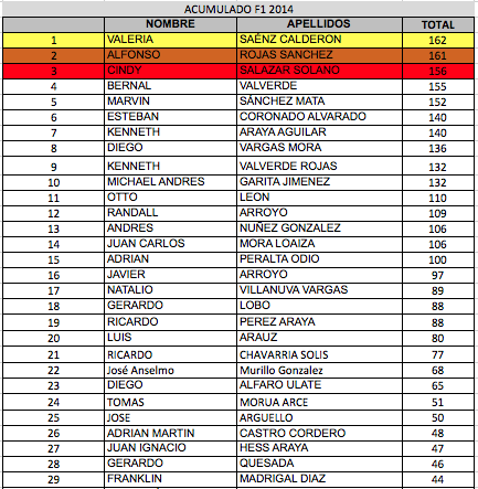 A falta de cuatro fechas para que finalice la temporada de F1, la primera posición de la promoción nuevamente cambia y ubica a Valeria Sáenz como la líder, con un total 162 puntos, tan solo uno más que el segundo lugar Alfonso Rojas. El tercer lugar es para Cindy Salazar con 156 unidades y el cuarto puesto con 155 puntos es de Bernal Valverde.