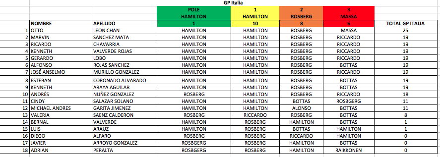 Luego de este resultado, el primer lugar de nuestro concurso “Vive la F1 a Puro Motor” cambia y ahora presenta un empate a 139 puntos entre Esteban Coronado y Kenneth Araya, además solo hay siete puntos de diferencia entre los cinco primeros puestos.