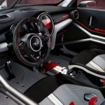 En su interior el enfoque deportivo reluce y solo dispone de elementos necesarios. Este nuevo concepto elimina los asientos traseros con el objetivo de reducir peso, en su lugar se ha instalado una jaula antivuelco convirtiendo a este MINI en un verdadero biplaza.