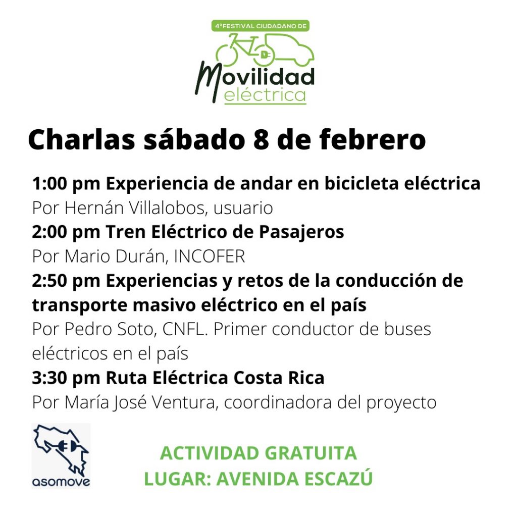 La cuarta edición del Festival Ciudadano de Movilidad Eléctrica, organizado por la Asociación Costarricense de Movilidad Eléctrica (Asomove) y Costa Rica Limpia, con el apoyo de Avenida Escazú, Banco Promérica y Grupo ICE, presentará modelos de vehículos, motocicletas y bicicletas eléctricas, además los asistentes podrán conocer los beneficios del transporte eléctrico, su funcionamiento, y experiencias de los usuarios.