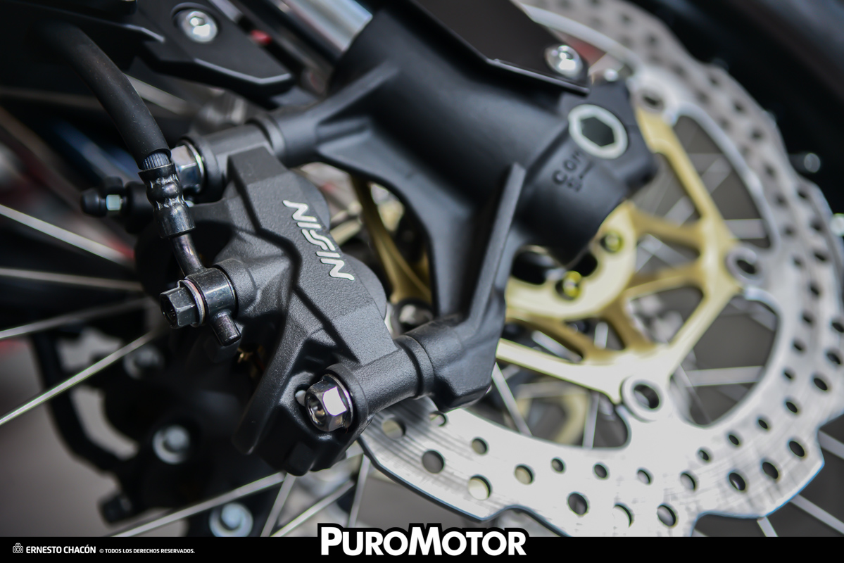 En tema de seguridad, que es una prioridad en este modelo, monta sistema ABS, freno delantero de doble disco de 310 mm de diámetro, con pinzas hidráulicas de anclaje radial de 4 pistones, y trasero de disco lobulado de 256 mm de diámetro, con pinza hidráulica de dos pistones.