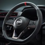 El interior presenta detalles rojos característicos de NISMO, incluido el volante de tres radios con una marca central roja. El panel de instrumentos tiene un acabado personalizado similar al carbono, y el control electrónico de cambios tiene un acabado de metal cromado.