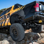 El paragolpes trasero también es nuevo, al igual que el del frontal, está fabricado con ligera fibra de carbono y no con metal, por lo que seguro que no perjudica en exceso el comportamiento dinámico del nuevo Toyota Hilux Tonka Concept. Este material también se ha empleado en el capó y en la puerta de la caja de carga, que para la ocasión ha sido equipada con un chasis tubular que permite colocar bidones de combustible, repuestos o material de rescate.
