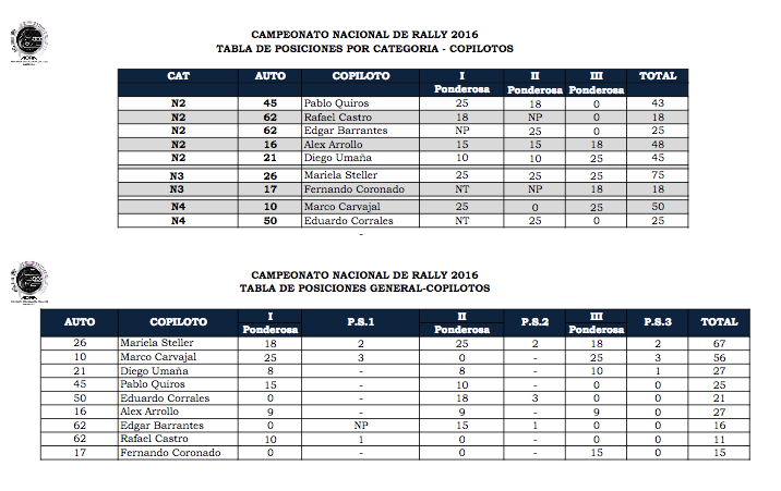“Luego de analizar una consulta planteada a la Junta Directiva sobre la aplicación del puntaje adicional por bonificación llamado Power Stage y realizadas las consultas necesarias a los Reglamentos que conciernen al Campeonato Nacional de Rally 2016, se realizó un ajuste a la tabla de posiciones publicada en días anteriores”, indica el comunicado.